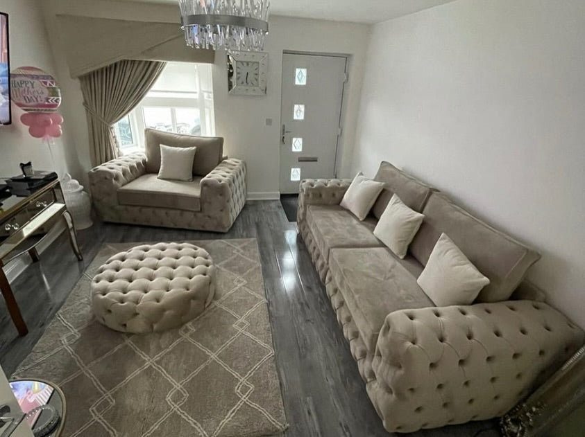 This modern, beautiful 3+2 Set features a magnificent button-tufted design making the Ankara a luxurious choice. With high-quality foam-filled cushions and a sumptuous Grey plush fabric finish, this sofa is as comfy as it is classy.